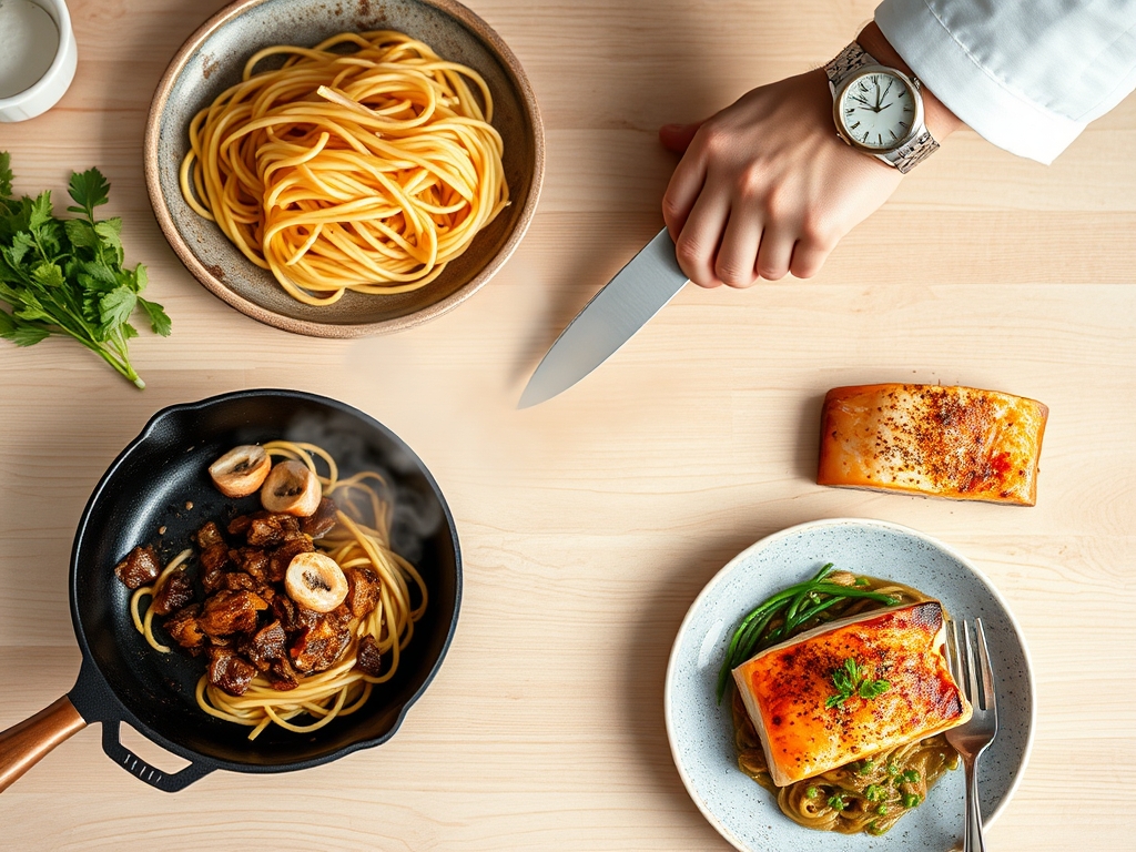The cooking phase is a sprint. Noodles generally take 3 to 8 minutes depending on the variety. Salmon requires about 4 minutes per side to reach a perfect medium-rare. The magic happens in the final 120 seconds when you deglaze the pan and toss the components together. By the time your table is set, the meal is ready.